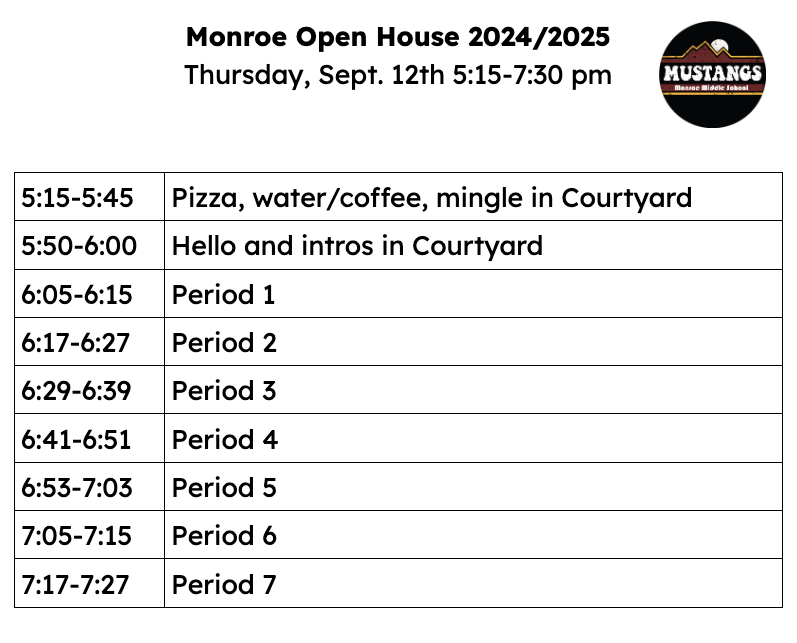 We hope you can join us for Open House on Thursday, September 12th, 5:15-7:30 PM. It’s a great opportunity for a brief meet and greet with our staff. You will get the chance to hear from our staff and visit classrooms (10 minute rotations) all while enjoying some FREE pizza! Students are encouraged to come and please bring a copy of your student's schedule or have ParentVUE pulled up. There will be staff in the courtyard to help.